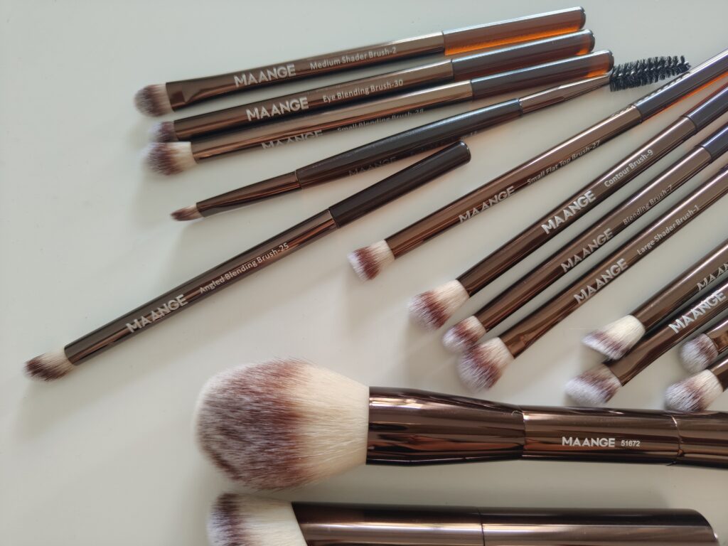 I pennelli Maange, proposti su Shein in set completi da 10, 20 o più pezzi, si distinguono per un design funzionale e curato. Ogni pennello è composto da setole sintetiche ultra morbide, spesso in fibra di nylon o microfibra, ideali per lavorare con texture sia in polvere che in crema. Le forme variano da pennelli piatti e densi per fondotinta, a pennelli affusolati per correttori e polveri fissante, fino a quelli più piccoli e precisi per sfumature occhi, eyeliner e dettagli. Le ghiere in alluminio sono leggere ma resistenti, ben fissate ai manici in plastica o legno verniciato, spesso dal design elegante in finitura opaca o metallizzata. La densità delle setole è ben bilanciata: abbastanza compatta da offrire controllo, ma flessibile per una stesura uniforme e naturale.